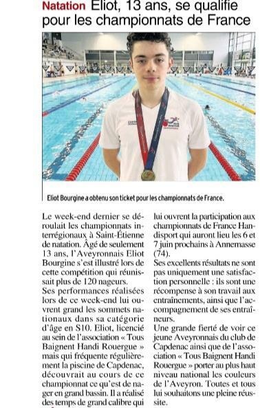 Au détour de sa participation aux Inter-Région Handisport à St Etienne Eliot a réalisé les minimas sur 50m en 36"40 et 400m NL en 6'05 en grand bassin (50m) qui lui ouvre les portes des championnats de France début juin. (voir article joint)